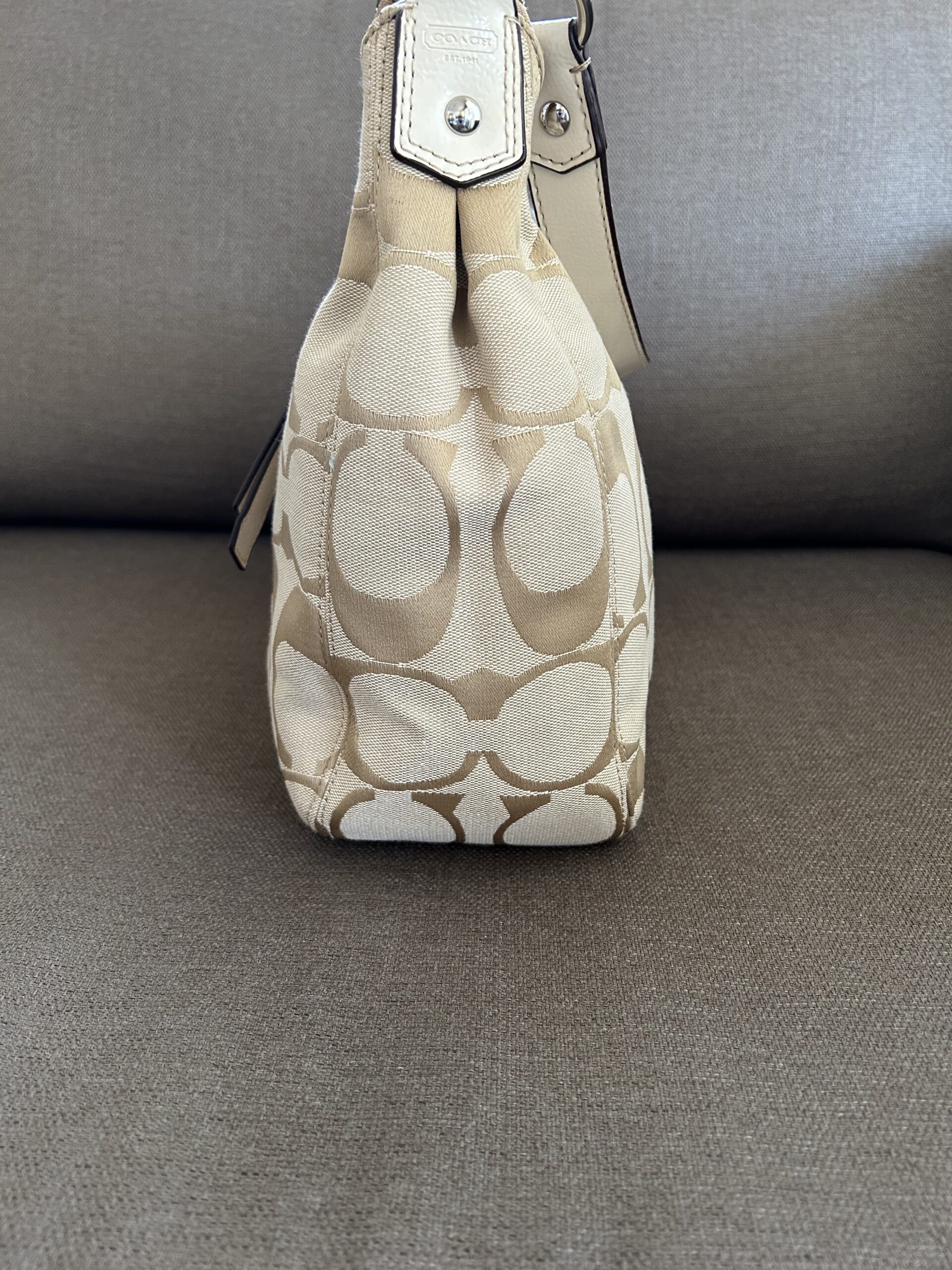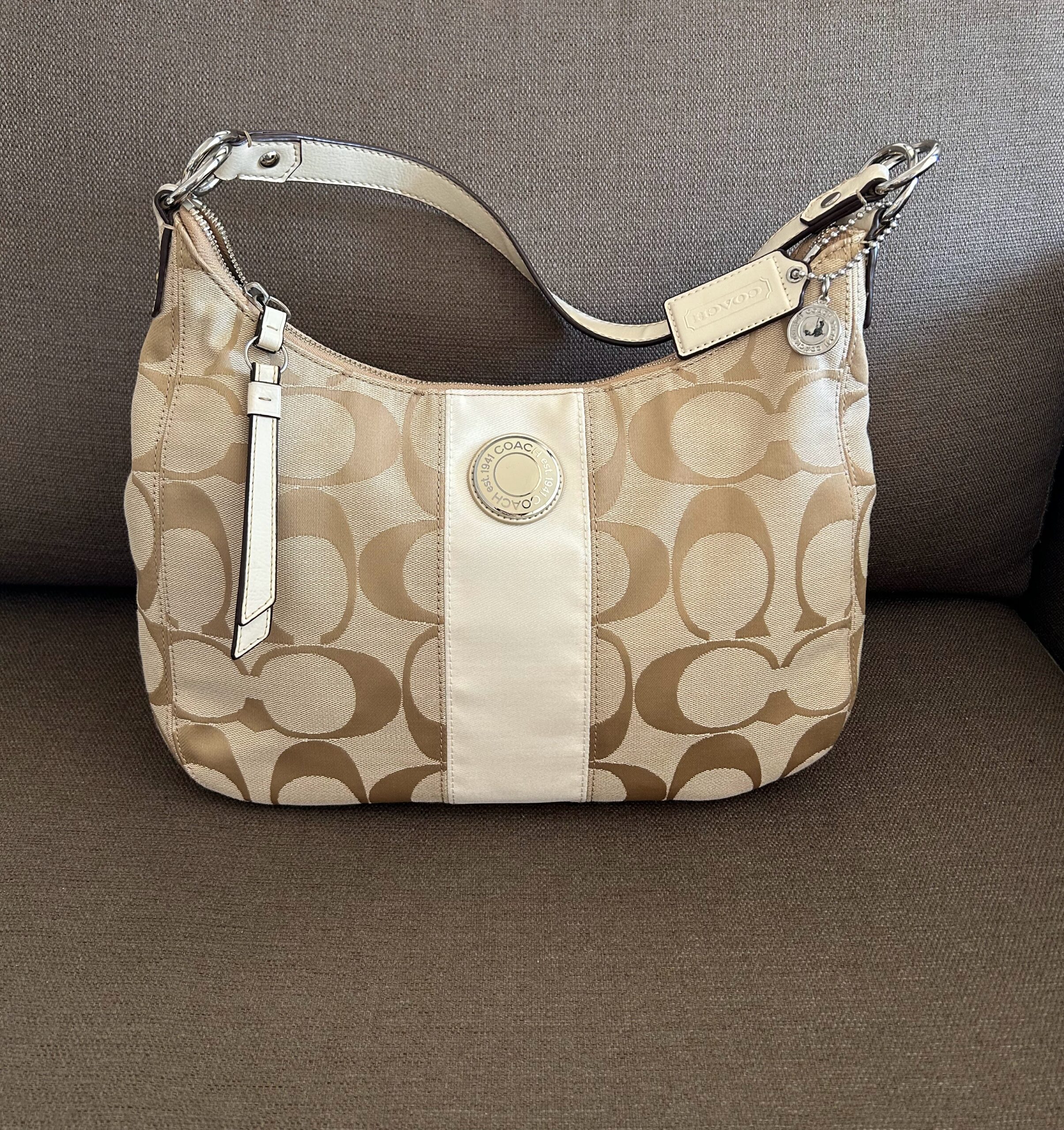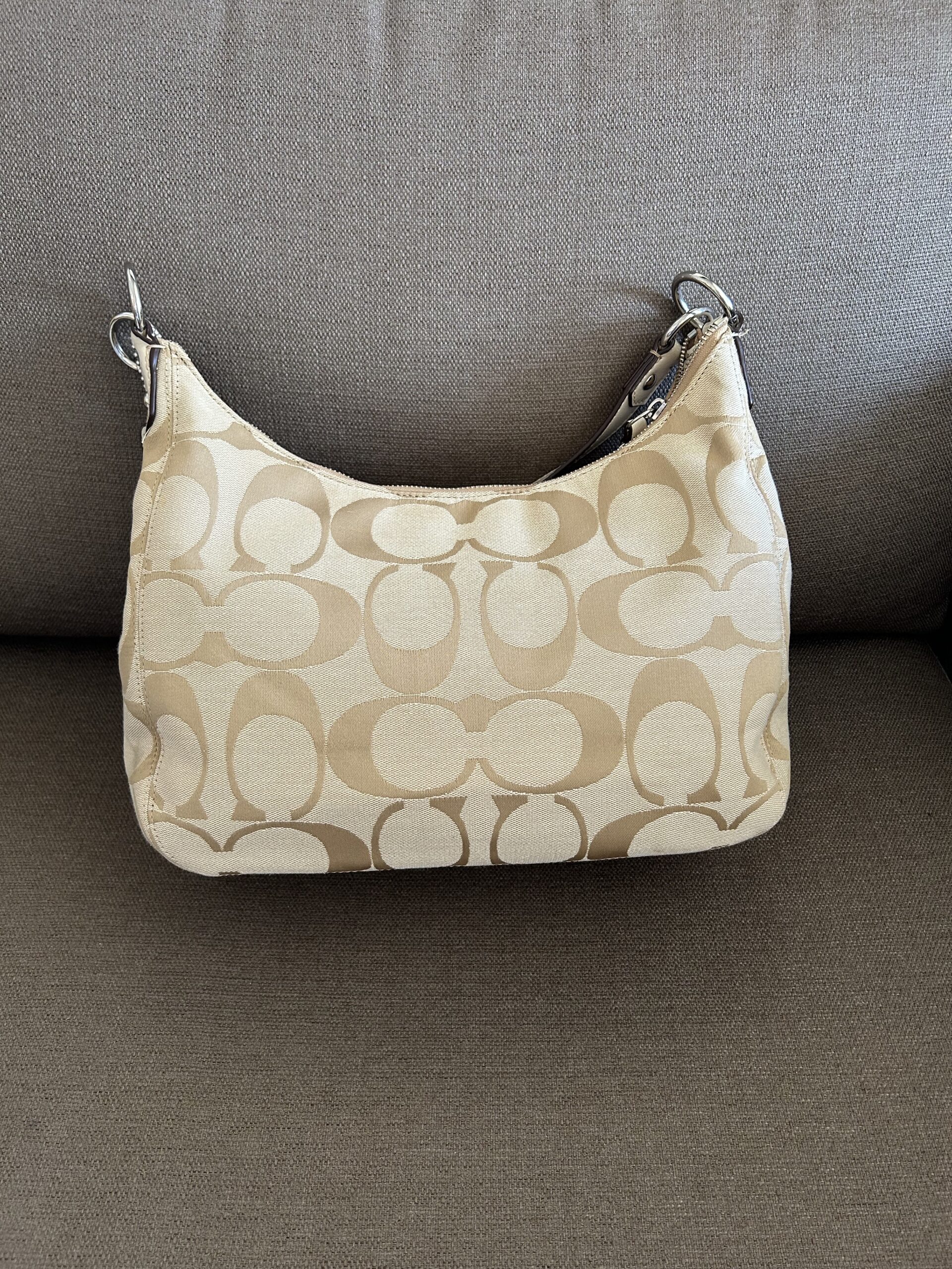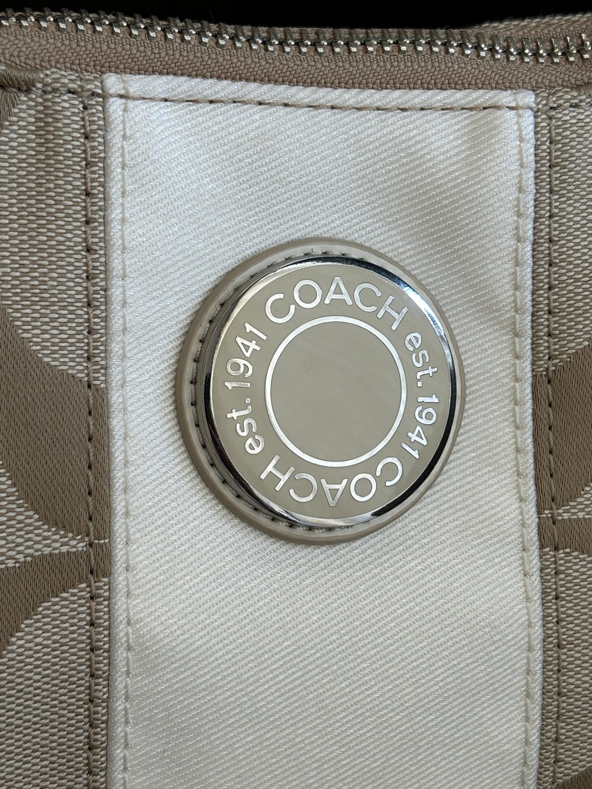 תיק כתף מבית האופנה האמריקאי COACH. תיק מהמם עם הדפס המונוגרם המוכר של המותג בגוונים חום וקרם עם סמל המותג במרכז התיק. התיק נסגר עם רוכסן ומכיל כיס נוסף ושני תאים פנימיים קטנים.