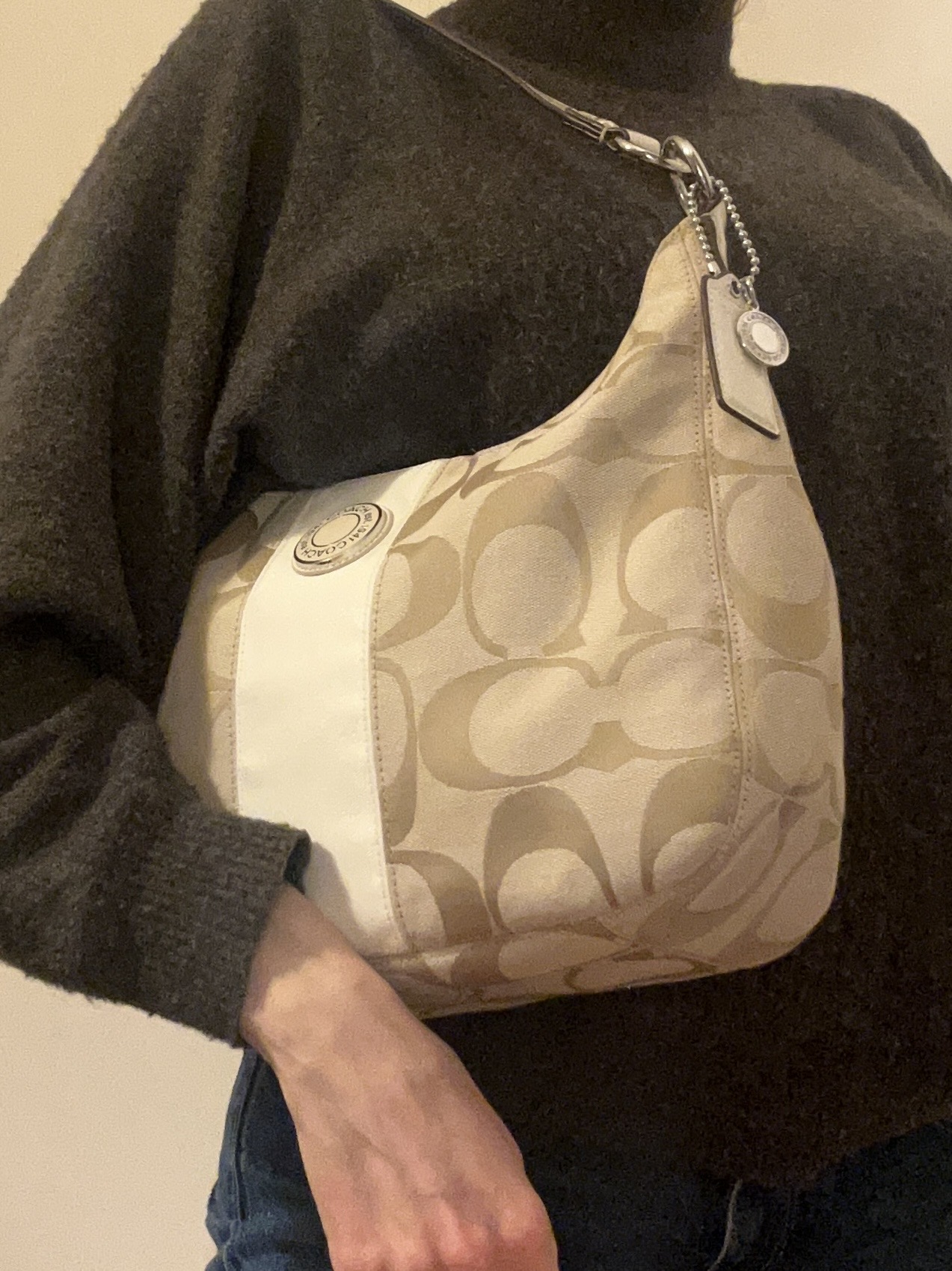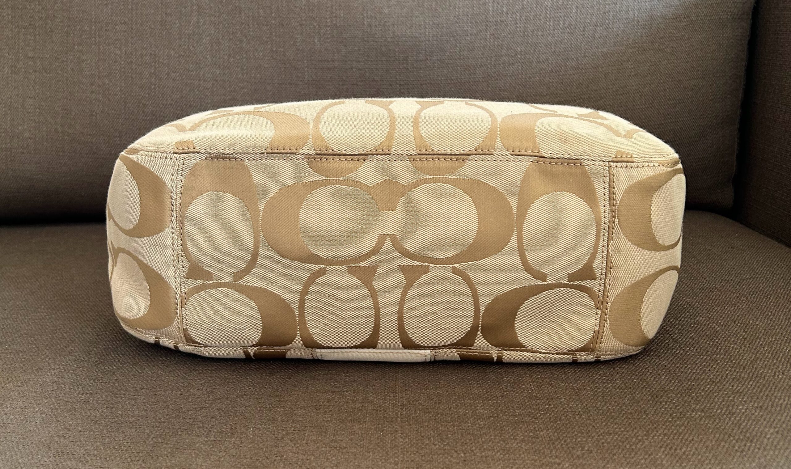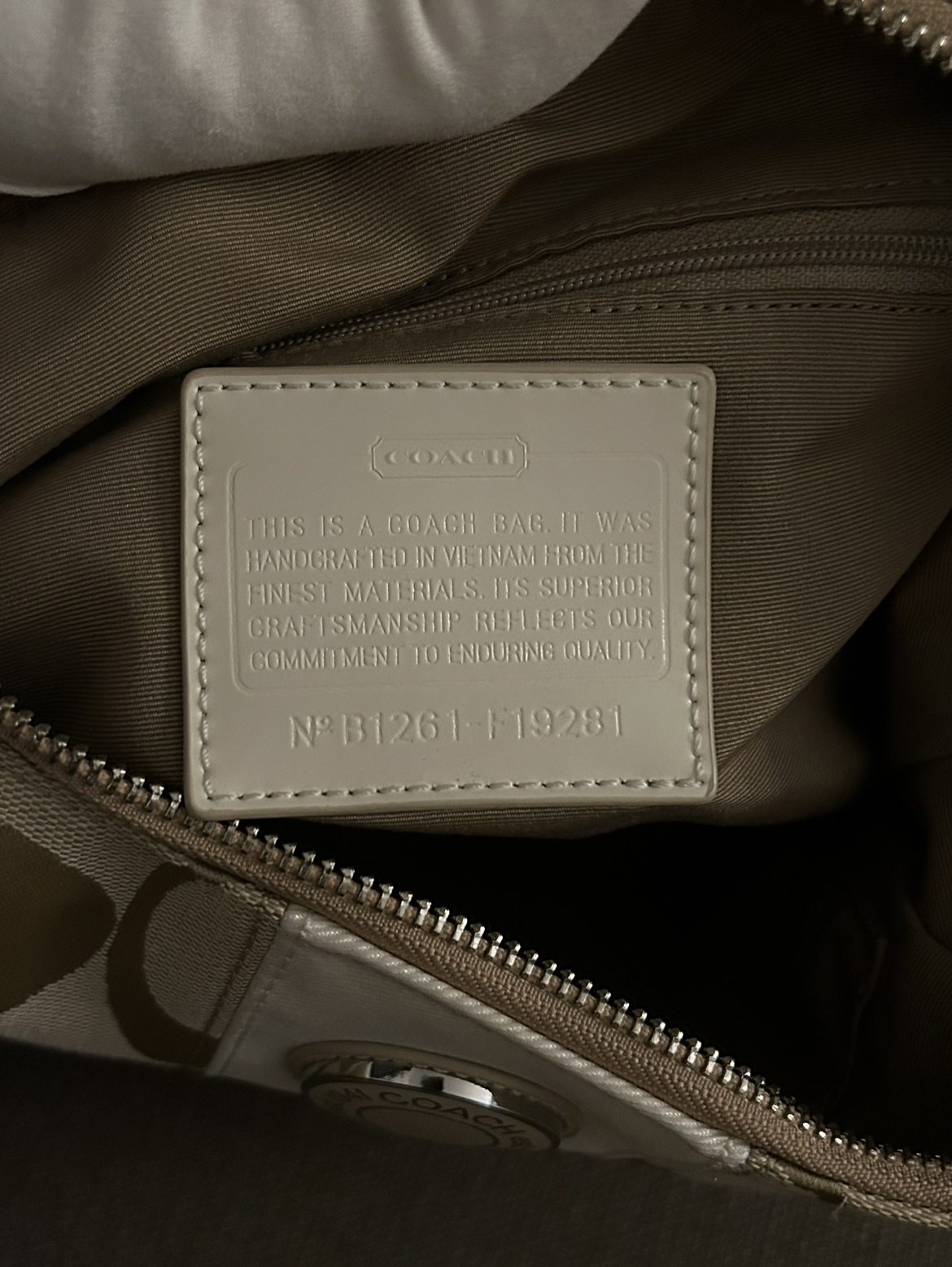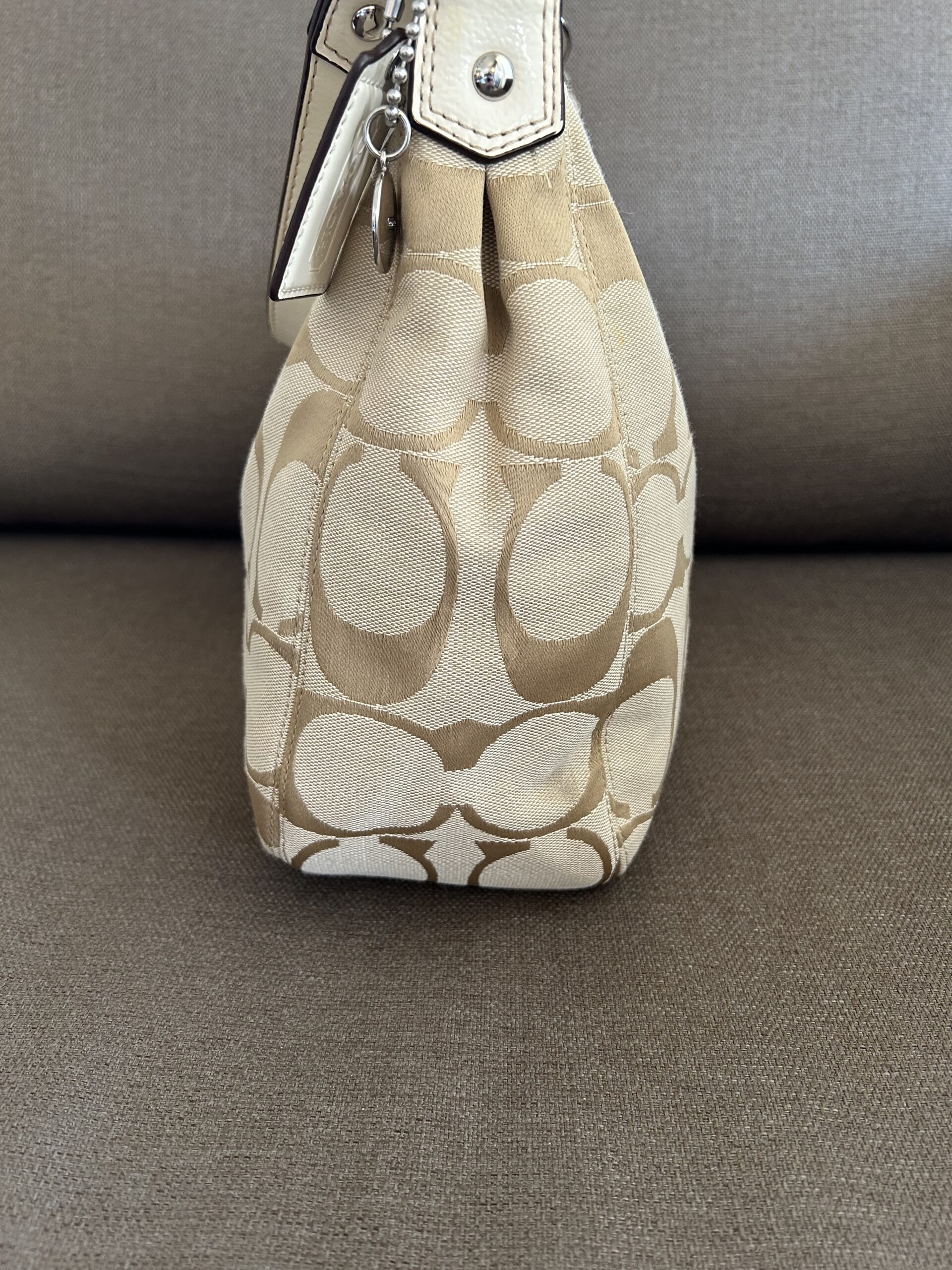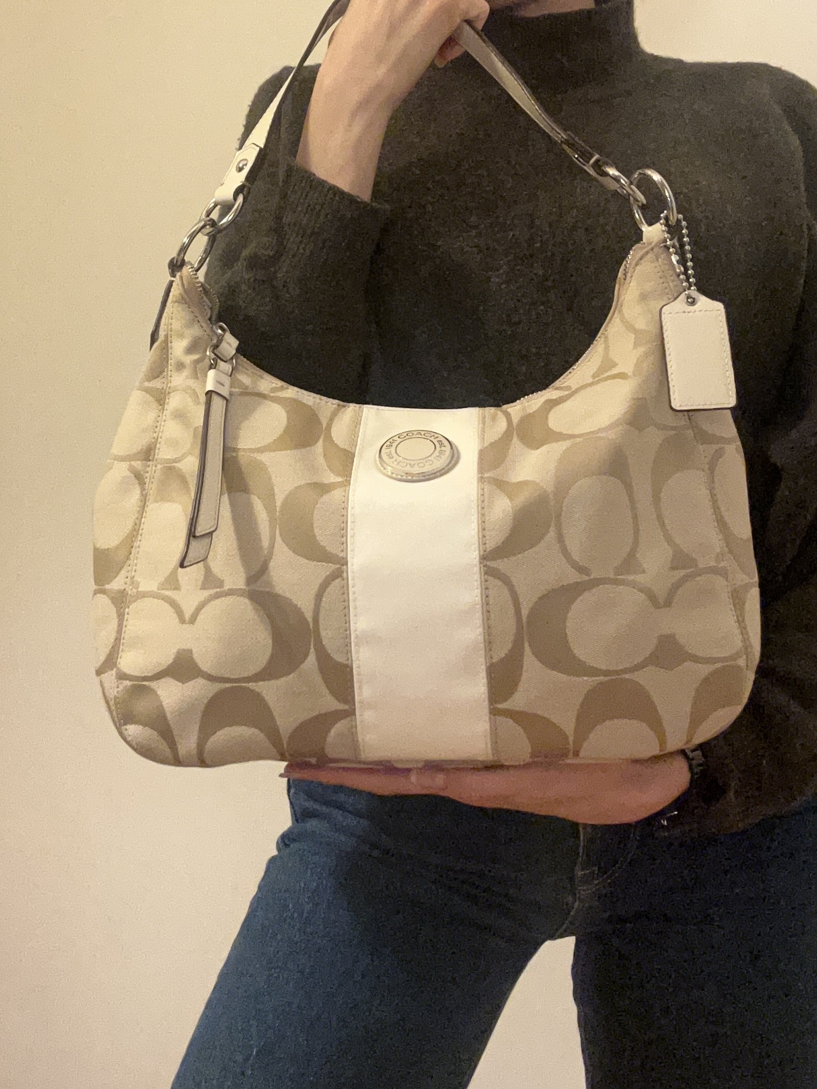 תיק כתף מבית האופנה האמריקאי COACH. תיק מהמם עם הדפס המונוגרם המוכר של המותג בגוונים חום וקרם עם סמל המותג במרכז התיק. התיק נסגר עם רוכסן ומכיל כיס נוסף ושני תאים פנימיים קטנים.
