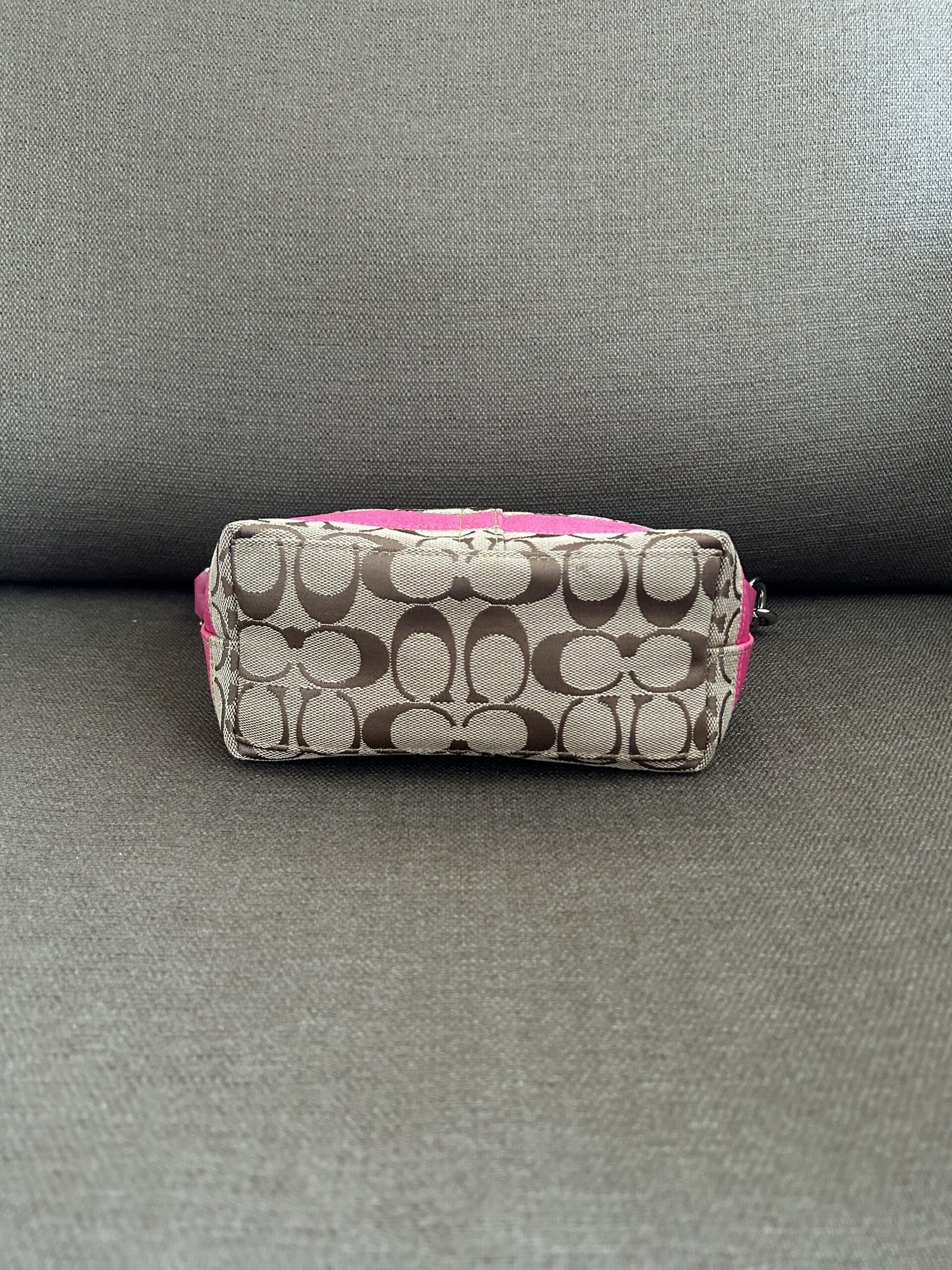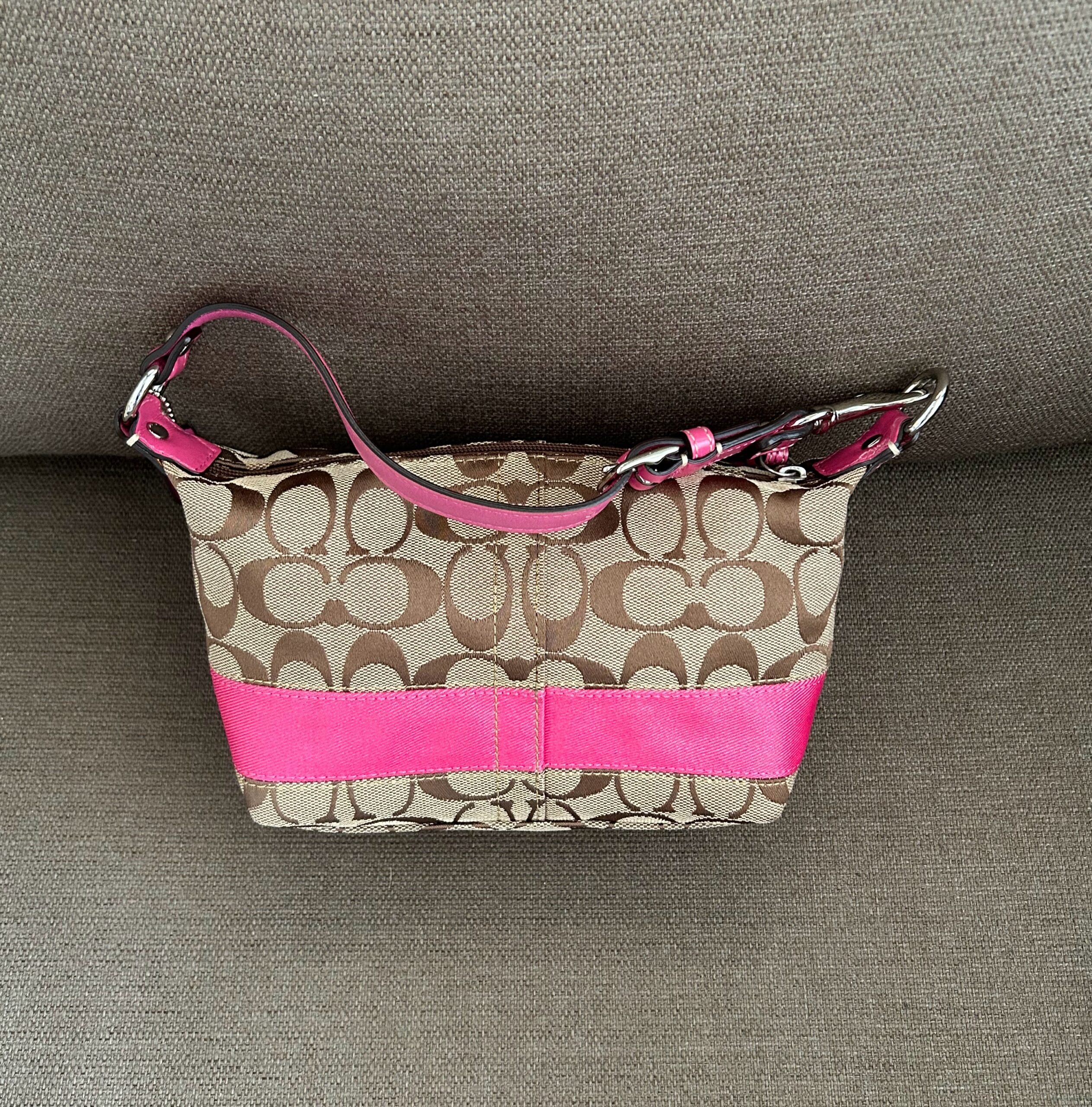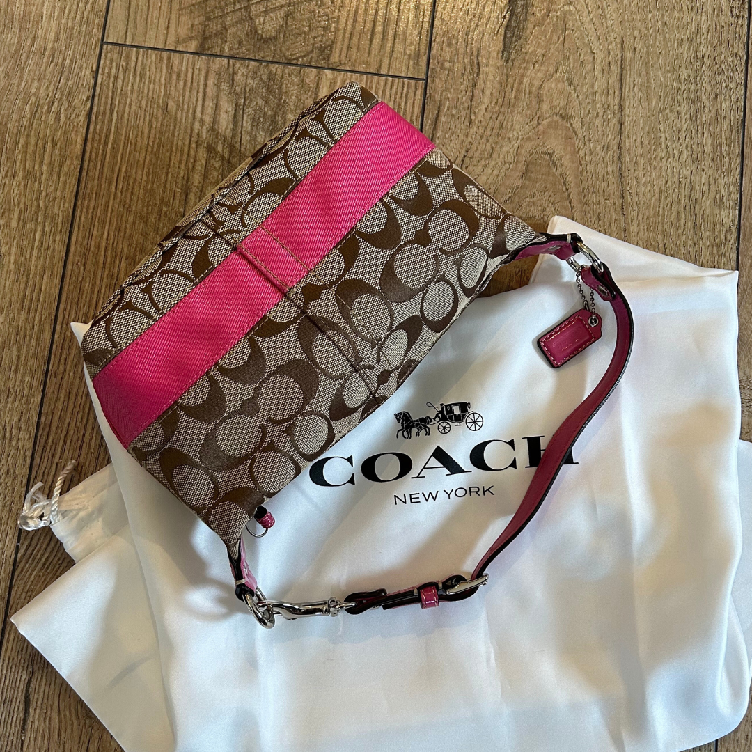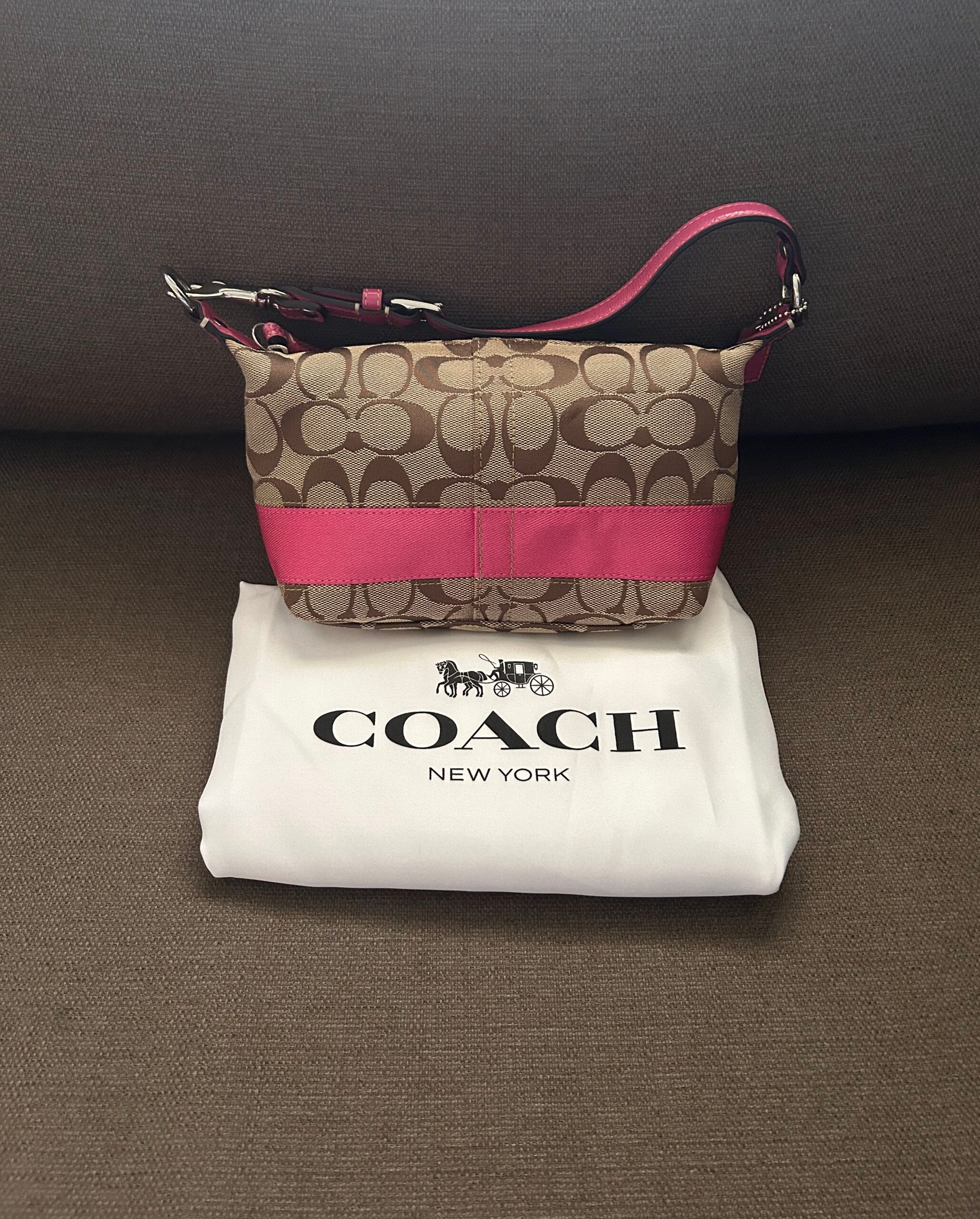 תיק כתף מבית האופנה האמריקאי COACH. תיק מהמם עם הדפס המונוגרם המוכר של המותג בגוונים חום עם תוספת ורודה מתוקה שתואמת לרצועה של התיק. התיק נסגר עם רוכסן ויכול להכיל מספר חפצים כולל טלפון נייד. ישנו גם תליון ורוד של COACH שמקשט את התיק.