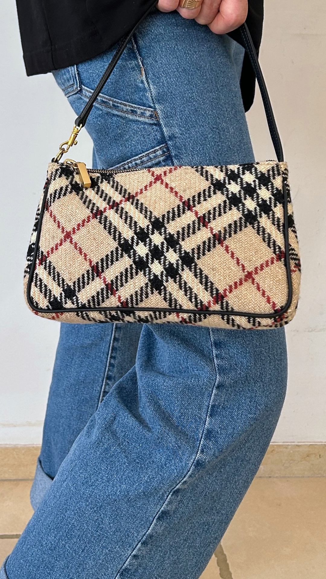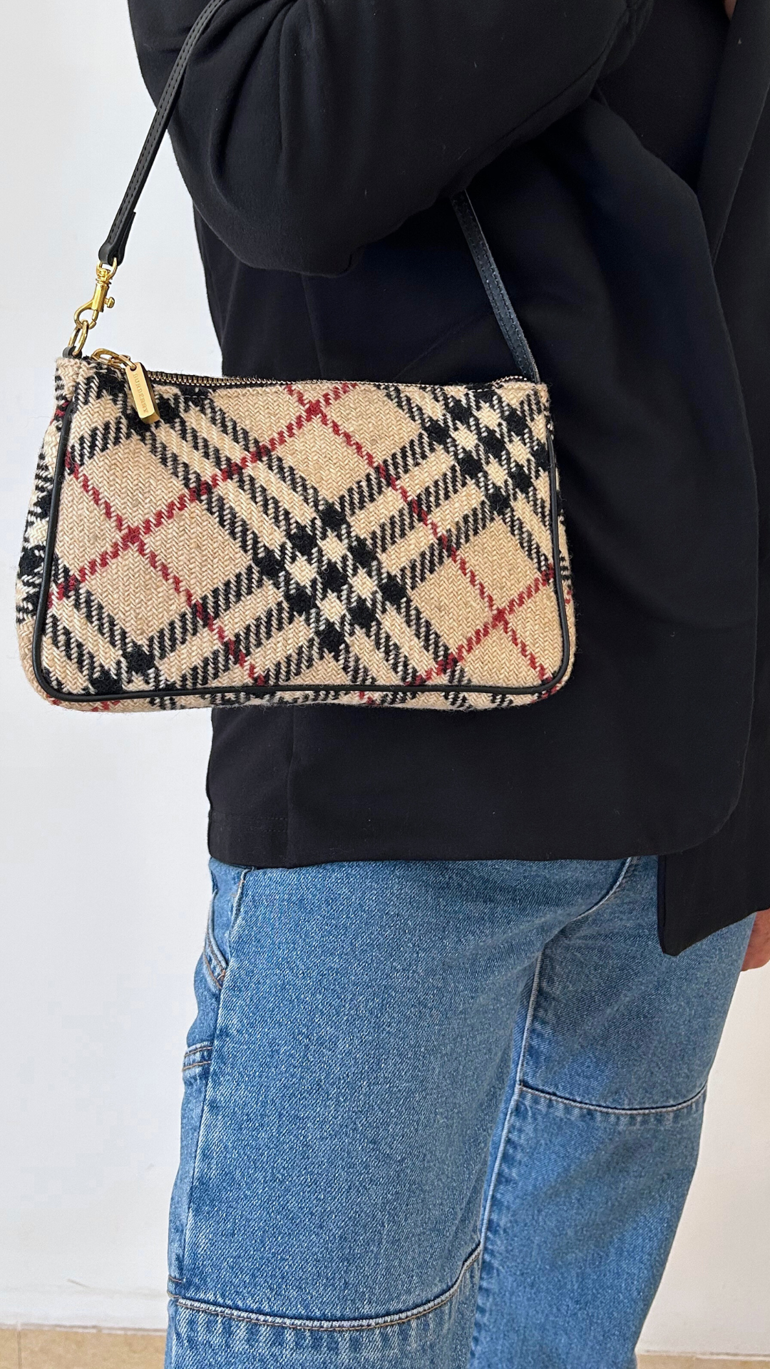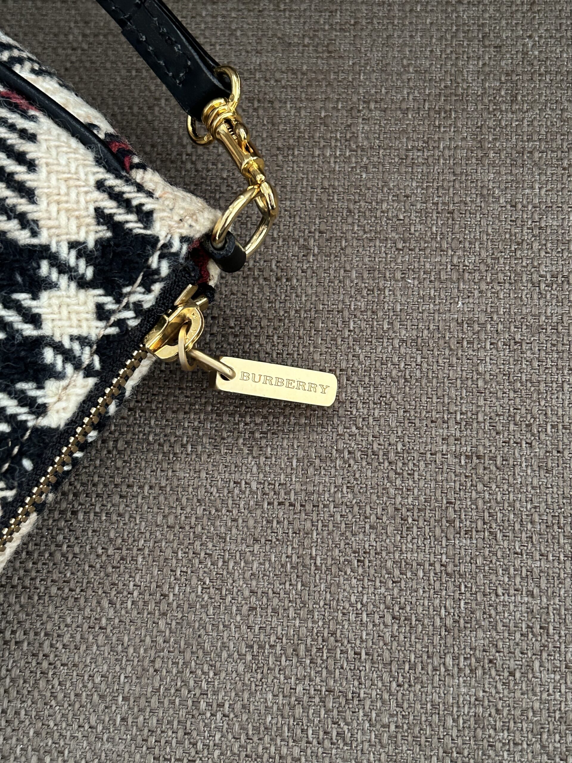 תיק כתף מהמם של Burberry עם ההדפס המוכר של המותג בגווני קרם. התיק נסגר עם רוכסן בעזרת אבזם מוזהב ממותג שמקשט את התיק ויכול להכיל מספר חפצים כולל טלפון נייד.