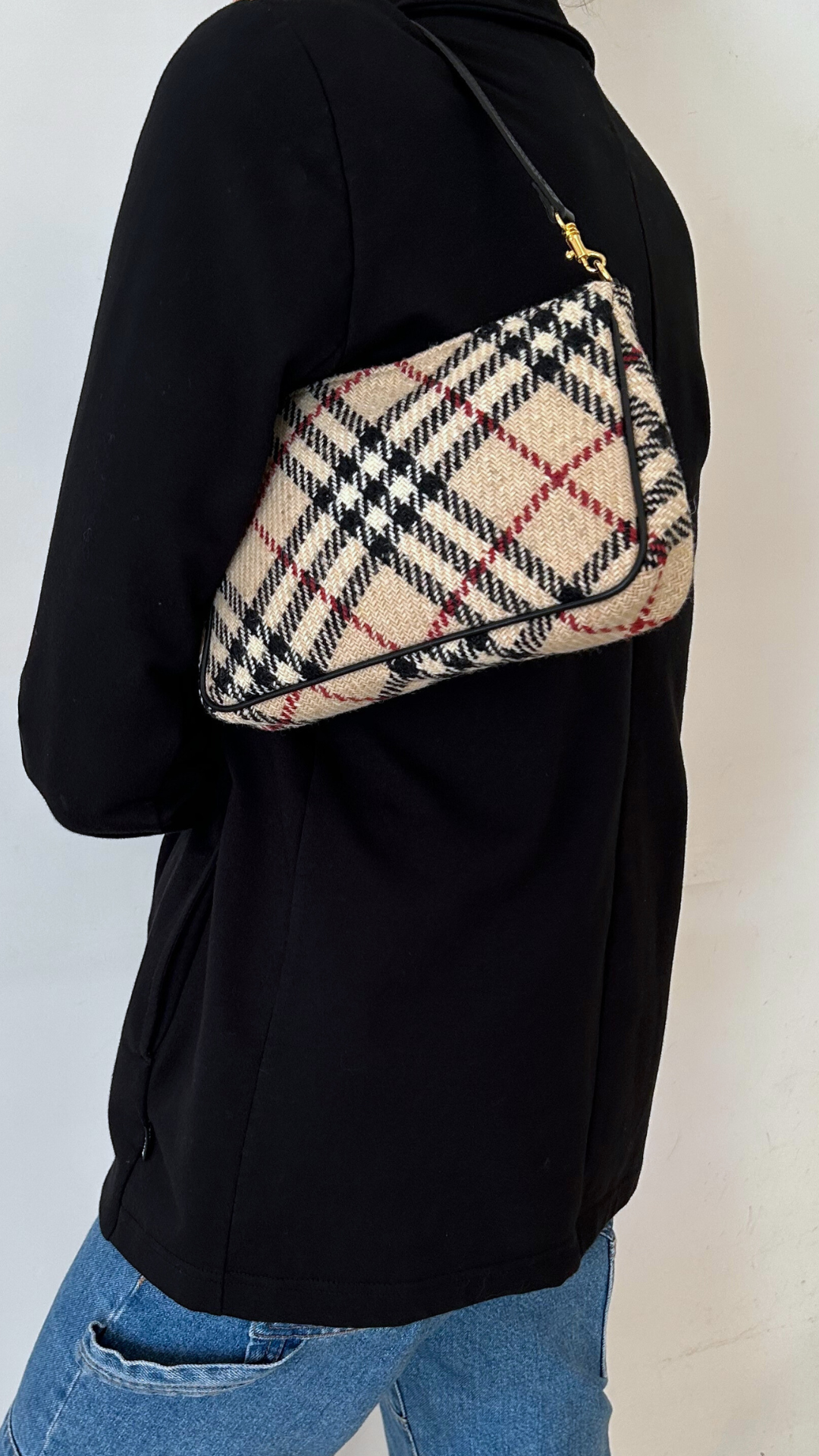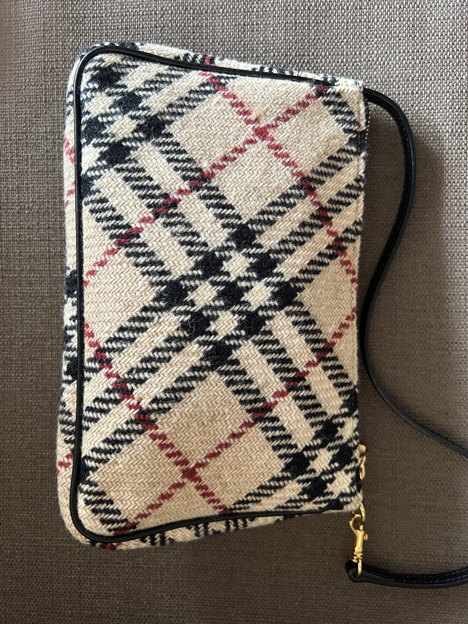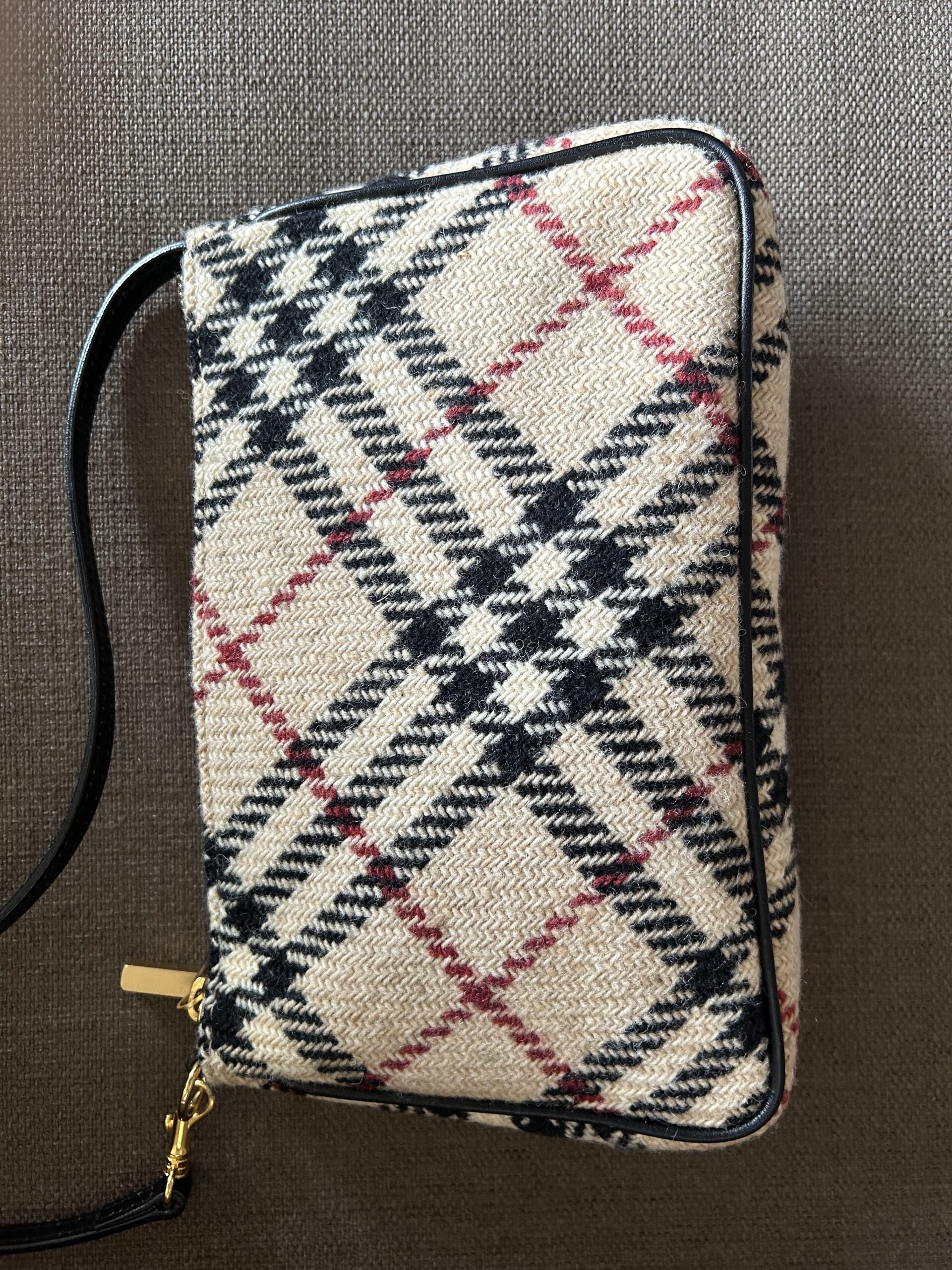 תיק כתף מהמם של Burberry עם ההדפס המוכר של המותג בגווני קרם. התיק נסגר עם רוכסן בעזרת אבזם מוזהב ממותג שמקשט את התיק ויכול להכיל מספר חפצים כולל טלפון נייד.