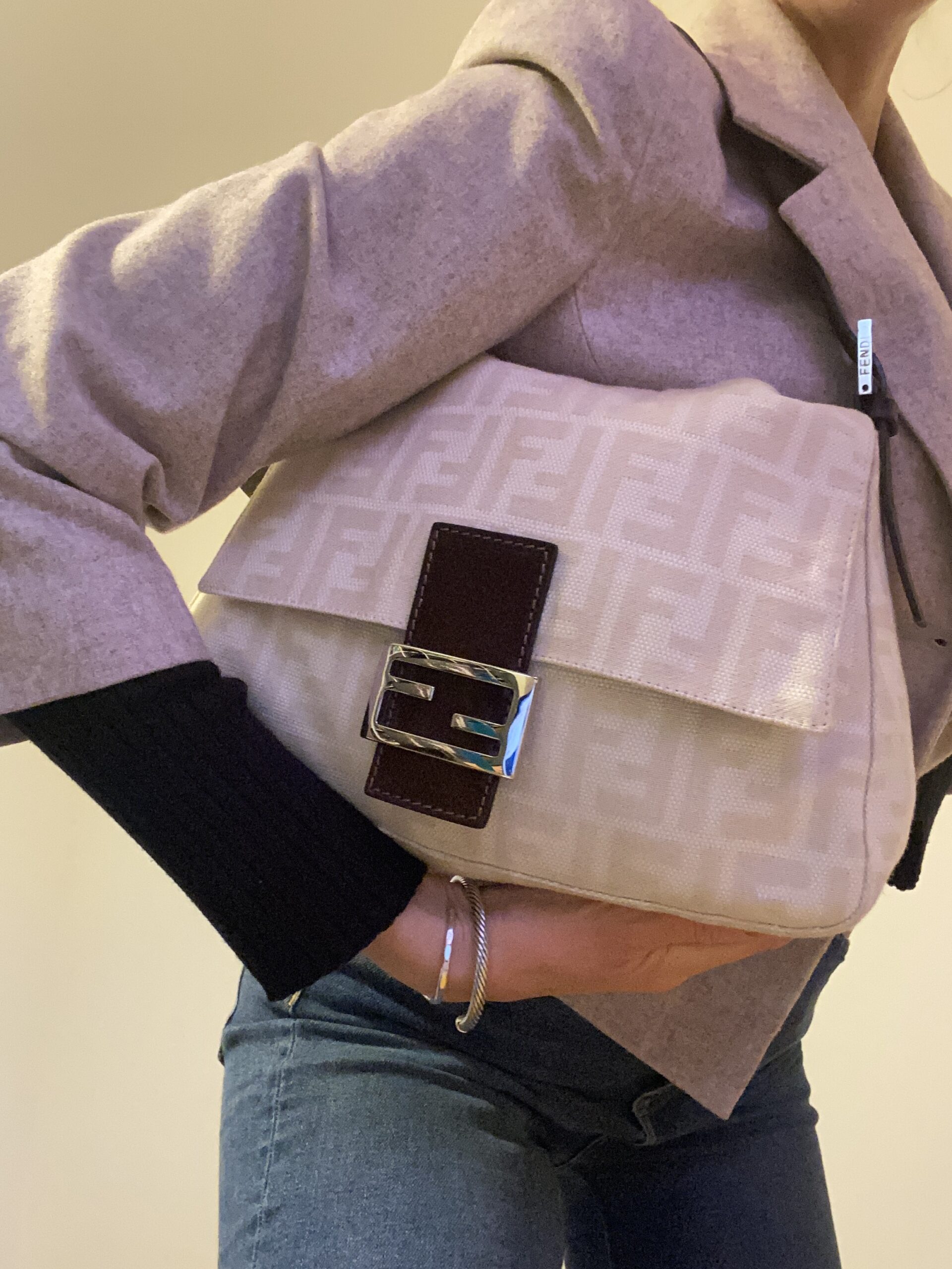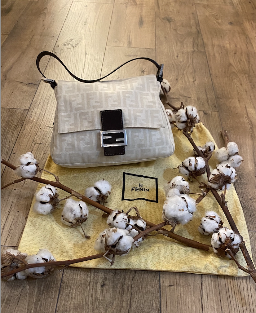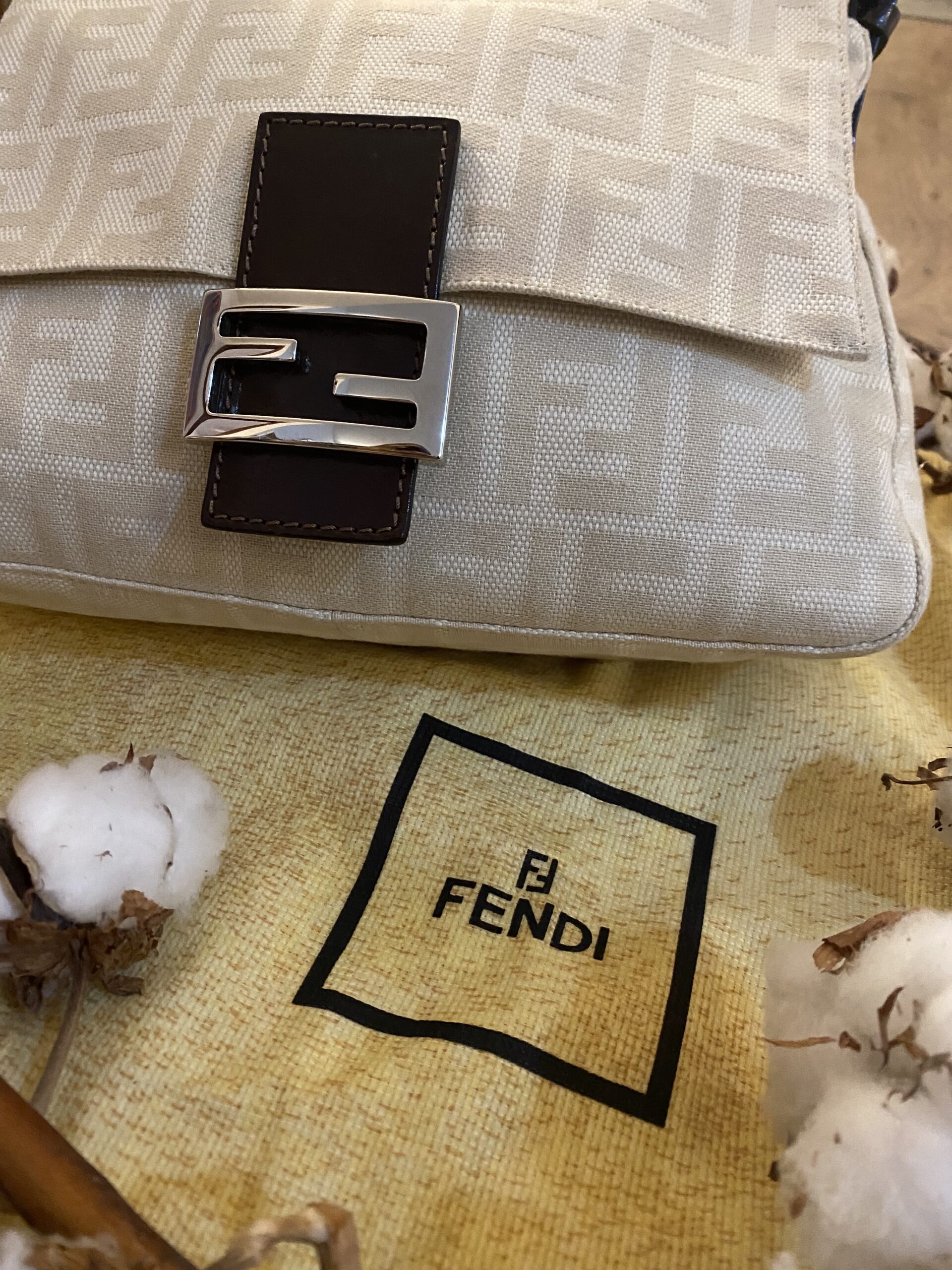 פנדי בגט דגם Mama, אחד מתיקי הוינטג׳ הנחשקים ובצדק! התיק עשוי קנבס עם הדפס מונוגרם Zucca האהוב בגוון בז׳ על רקע קרם חלומי ומגיע עם רצועות עור מתכווננות כך שניתן לגוון במראה של התיק. לתיק תא מרכזי מכיל שנסגר בסגירה מגנטית עם אבזם כסוף בצורת סמל המותג של פנדי. הסגירה המיוחדת של התיק מקנה לו מראה ייחודי שלא ניתן להתעלם ממנו, אנחנו פשוט התאהבנו בו.