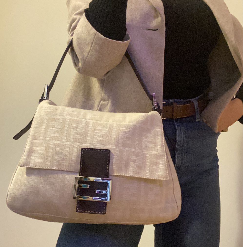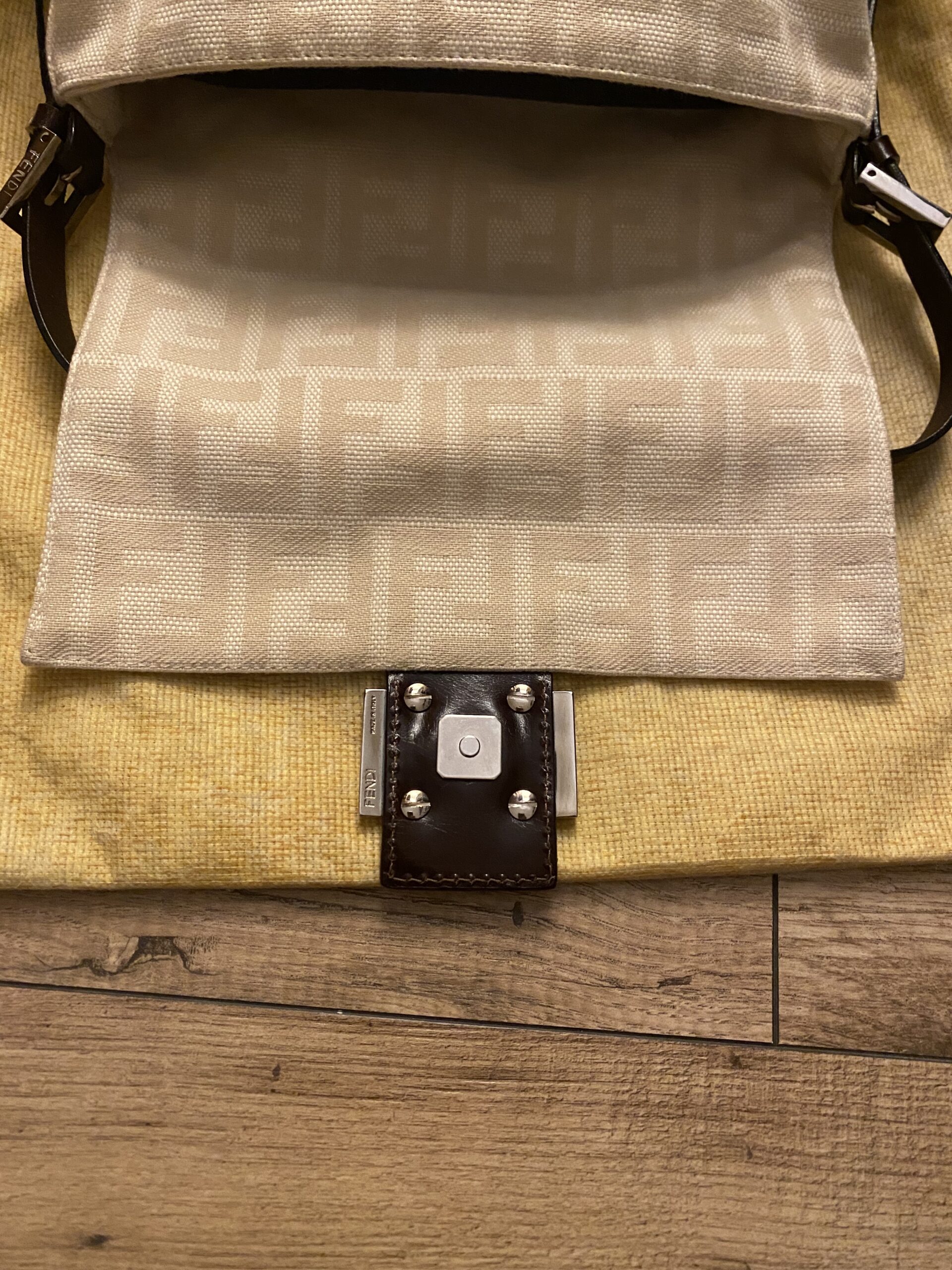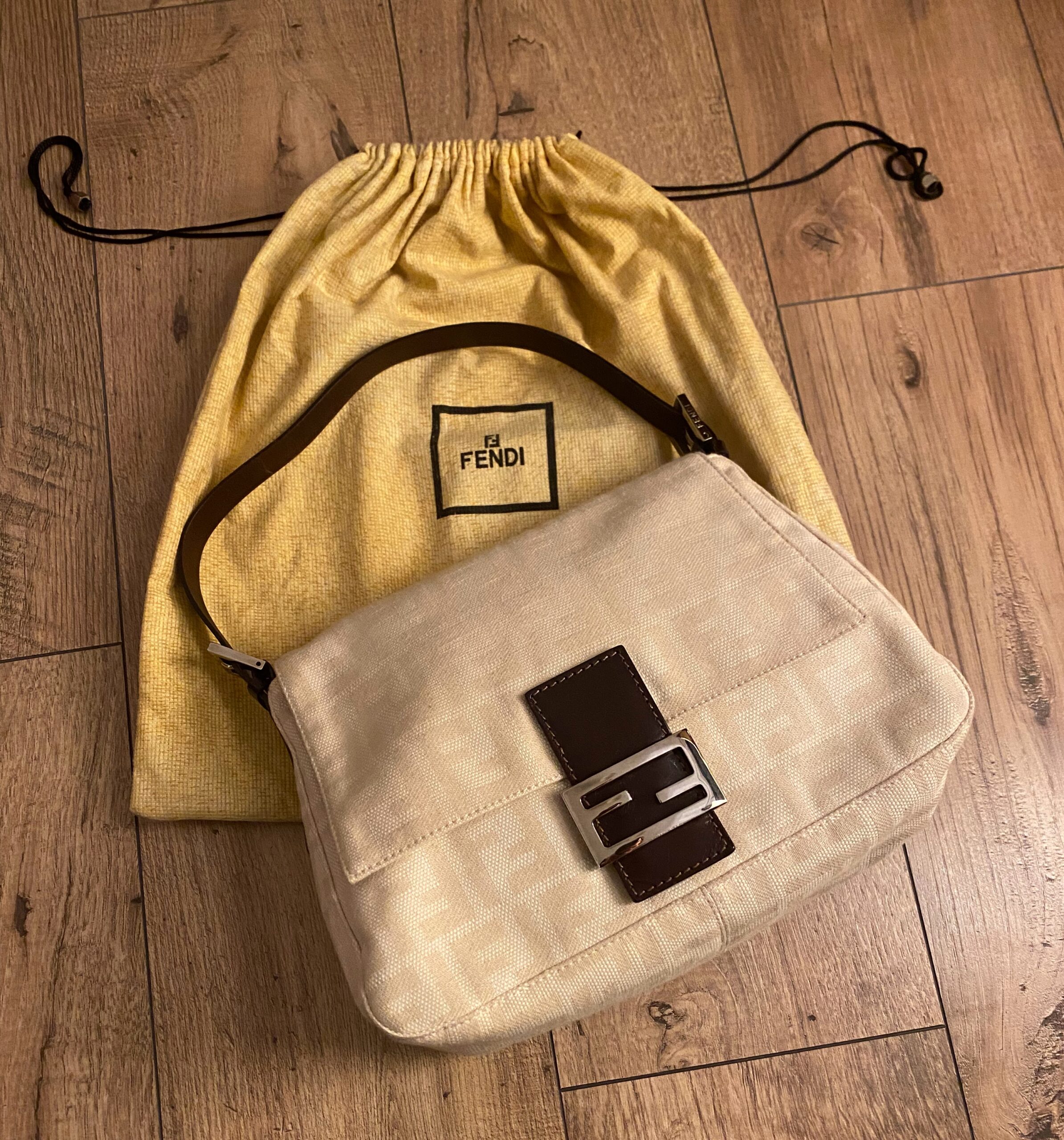 פנדי בגט דגם Mama, אחד מתיקי הוינטג׳ הנחשקים ובצדק! התיק עשוי קנבס עם הדפס מונוגרם Zucca האהוב בגוון בז׳ על רקע קרם חלומי ומגיע עם רצועות עור מתכווננות כך שניתן לגוון במראה של התיק. לתיק תא מרכזי מכיל שנסגר בסגירה מגנטית עם אבזם כסוף בצורת סמל המותג של פנדי. הסגירה המיוחדת של התיק מקנה לו מראה ייחודי שלא ניתן להתעלם ממנו, אנחנו פשוט התאהבנו בו.