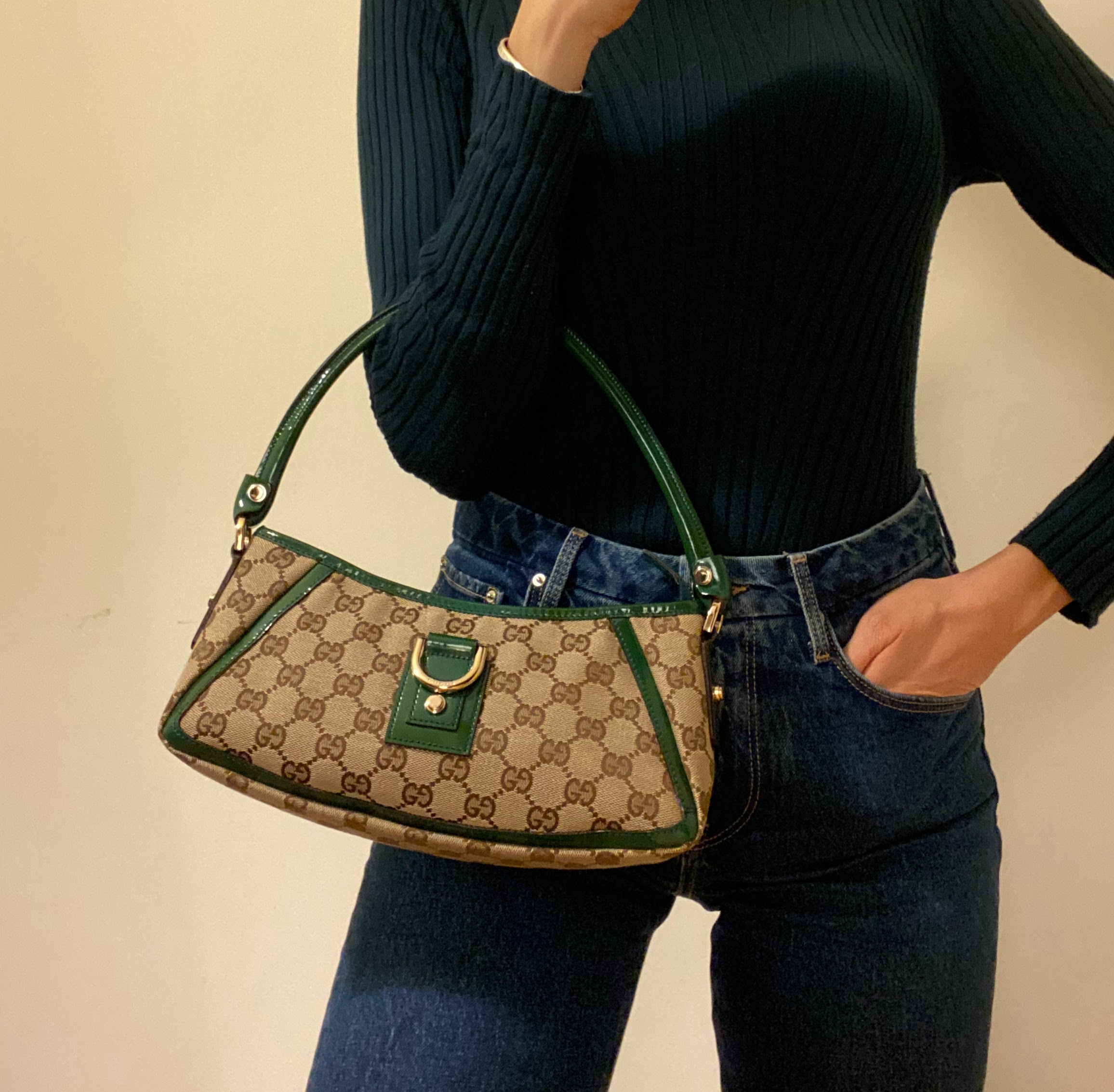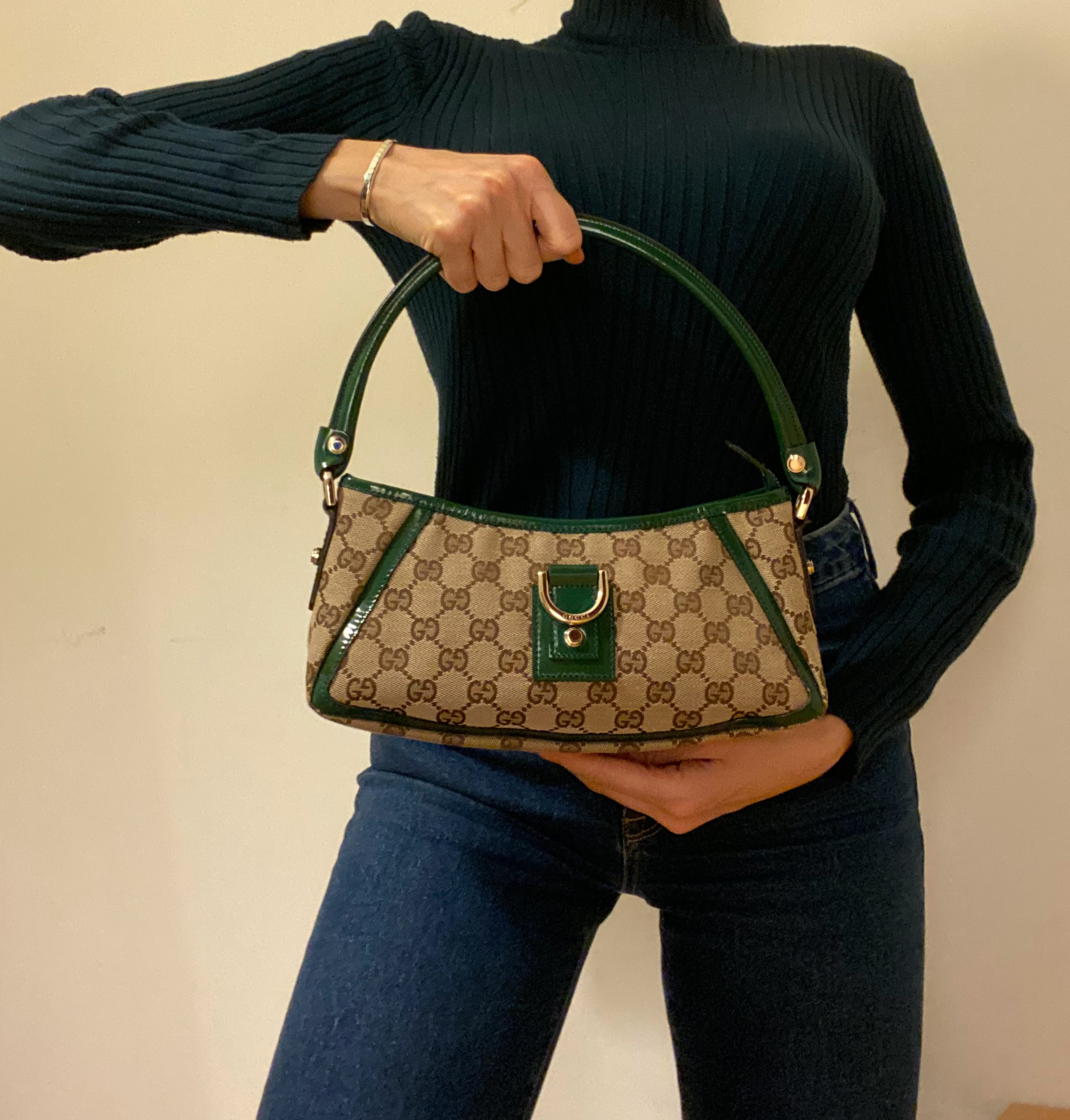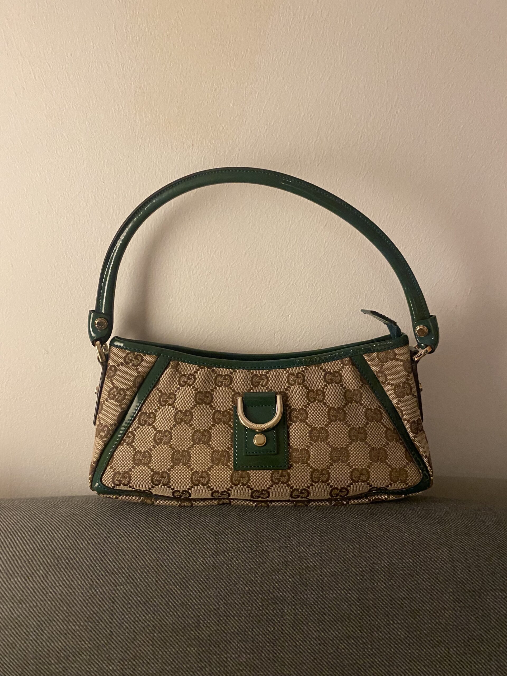 Gucci Abbey D-Ring Pochette with racing green patent leather trim