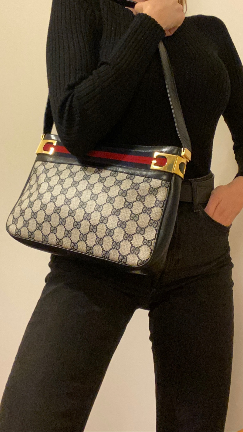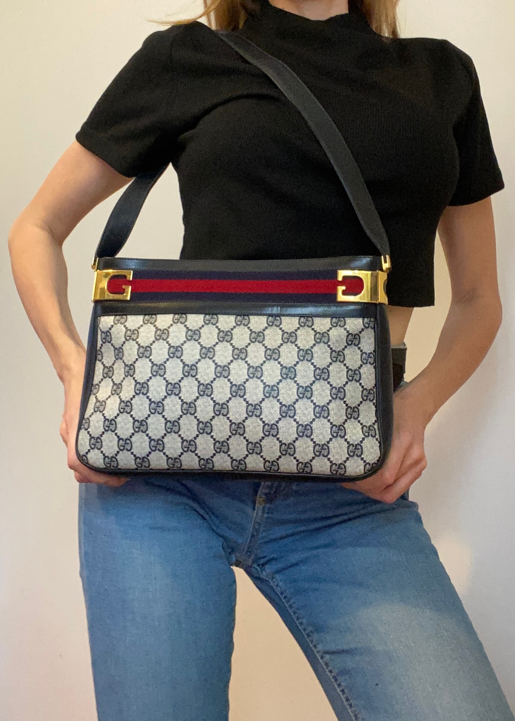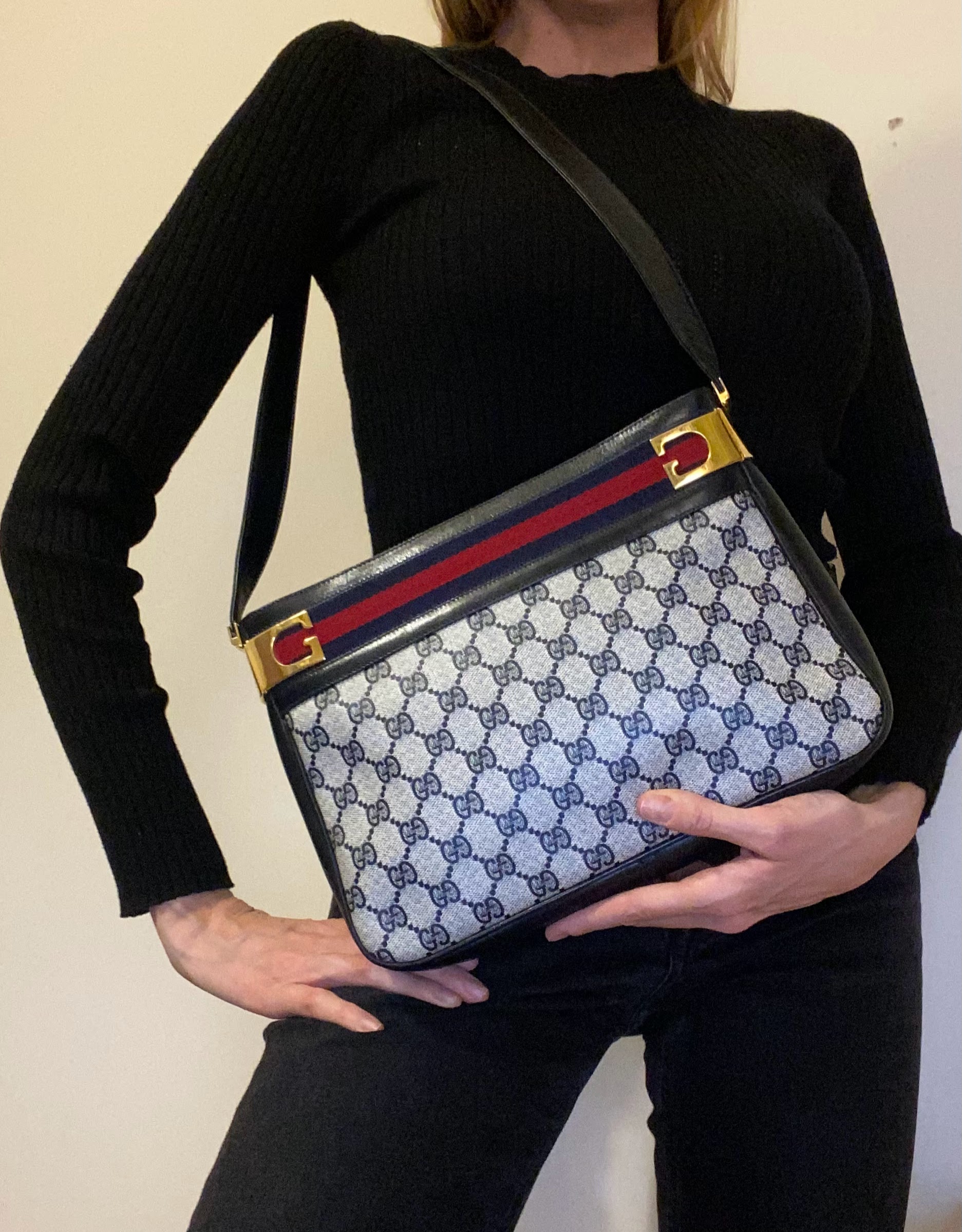 תיק כתף מהפנט מסדרת השרי ליין של גוצ׳י. יכול גם לעבוד כתיק קרוסבודי שיושב קצת גבוה על הגוף ליצרת מראה שסופר טרנדי כרגע. חלקו המרכזי של התיק מעוטר עם הדפס המונוגרם האהוב של בית האופנה בצבע כחול כהה על גבי רקע אפור בהיר. בחלקו העליון, משני צידי התיק, ישנם אבזמים מוזהבים עם סמל המותג שמחברים בין הפס האדום-כחול המוכר של גוצ׳י. השילוב המושלם של צבעי הזהב עם גווני הכחול יוצרים תיק על-זמני וייחודי. לתיק תא מרכזי ותא נוסף פנימי כאשר כל אחד מהם נסגר בעזרת רוכסן. התיק מגיע עם שקית אבק ממותגת.