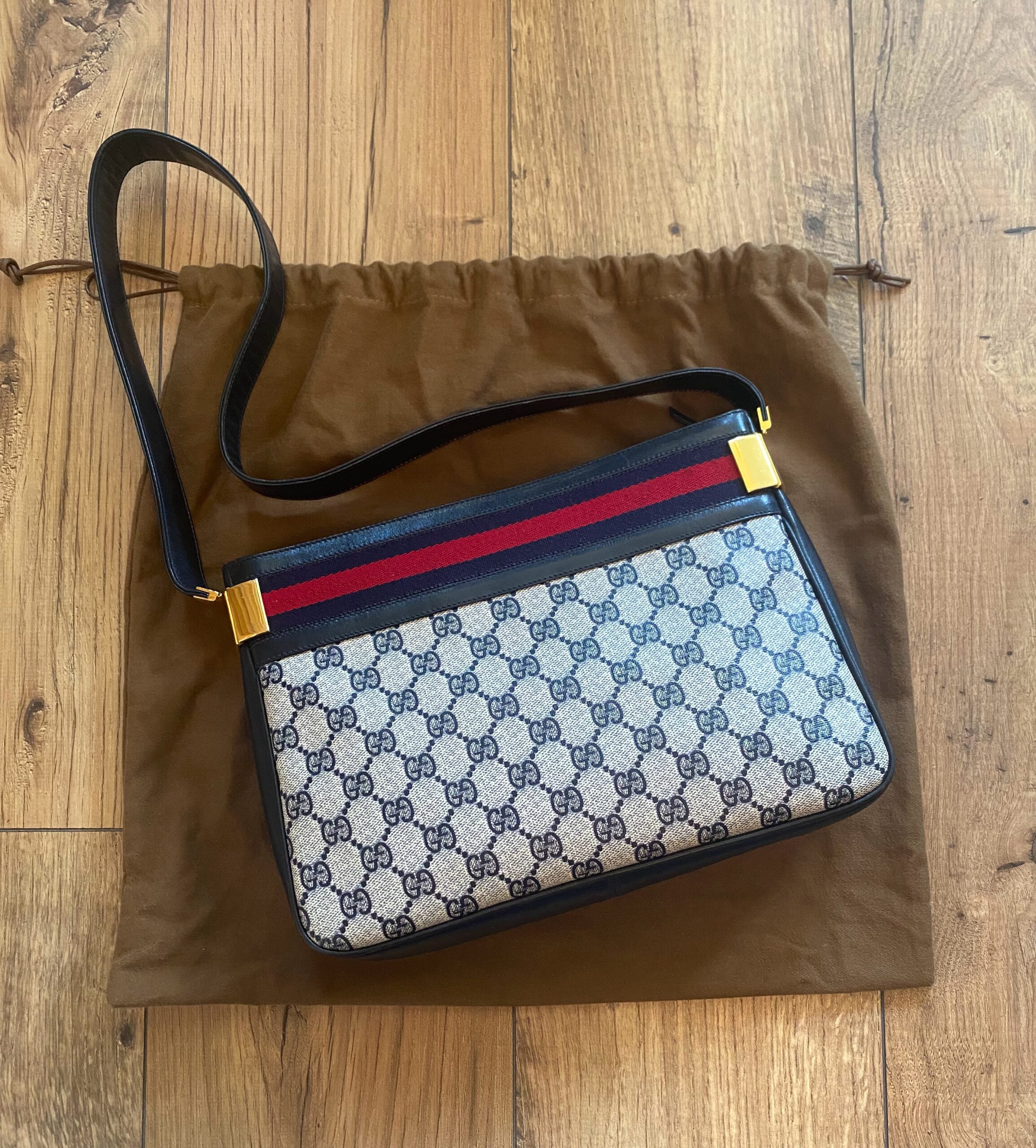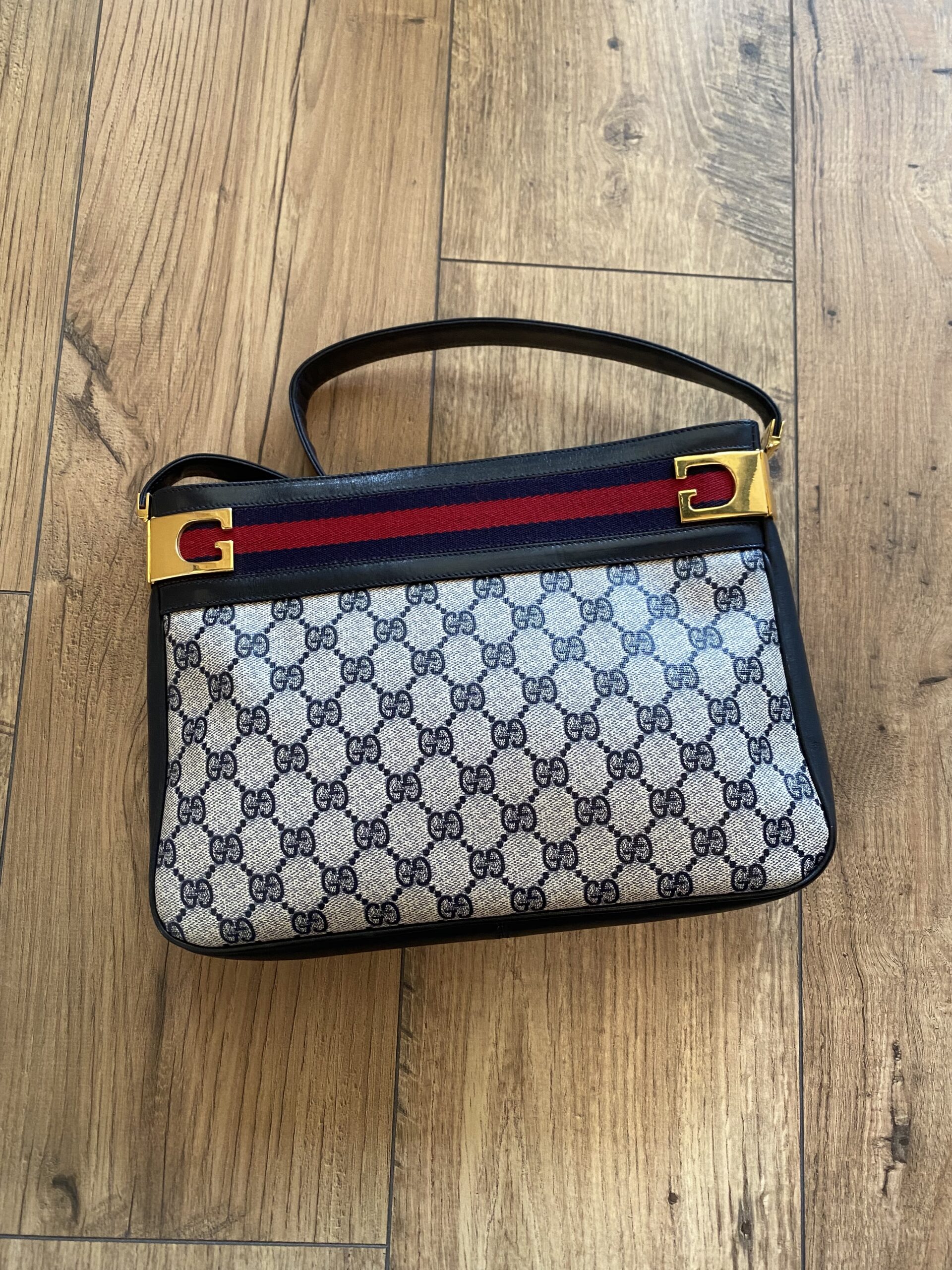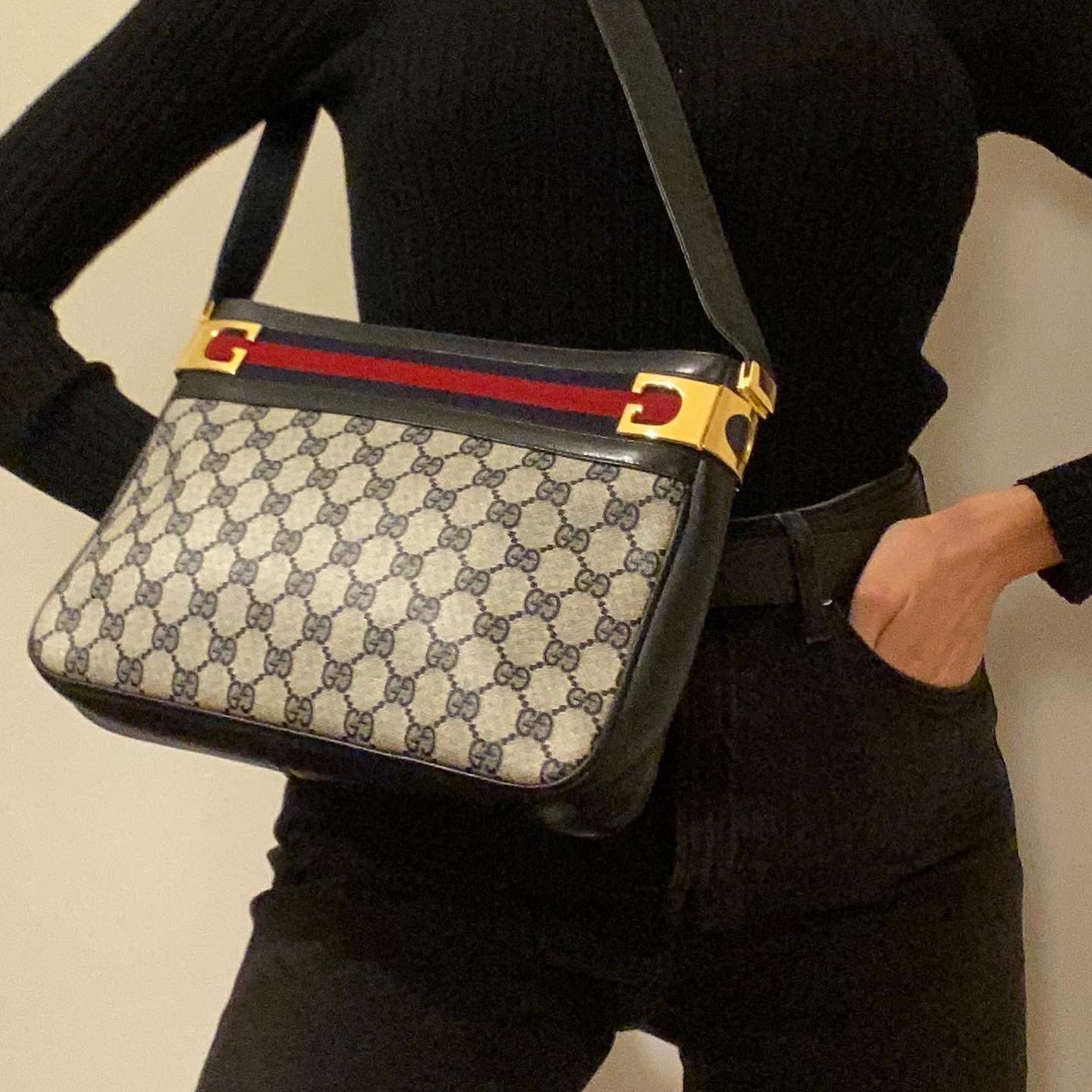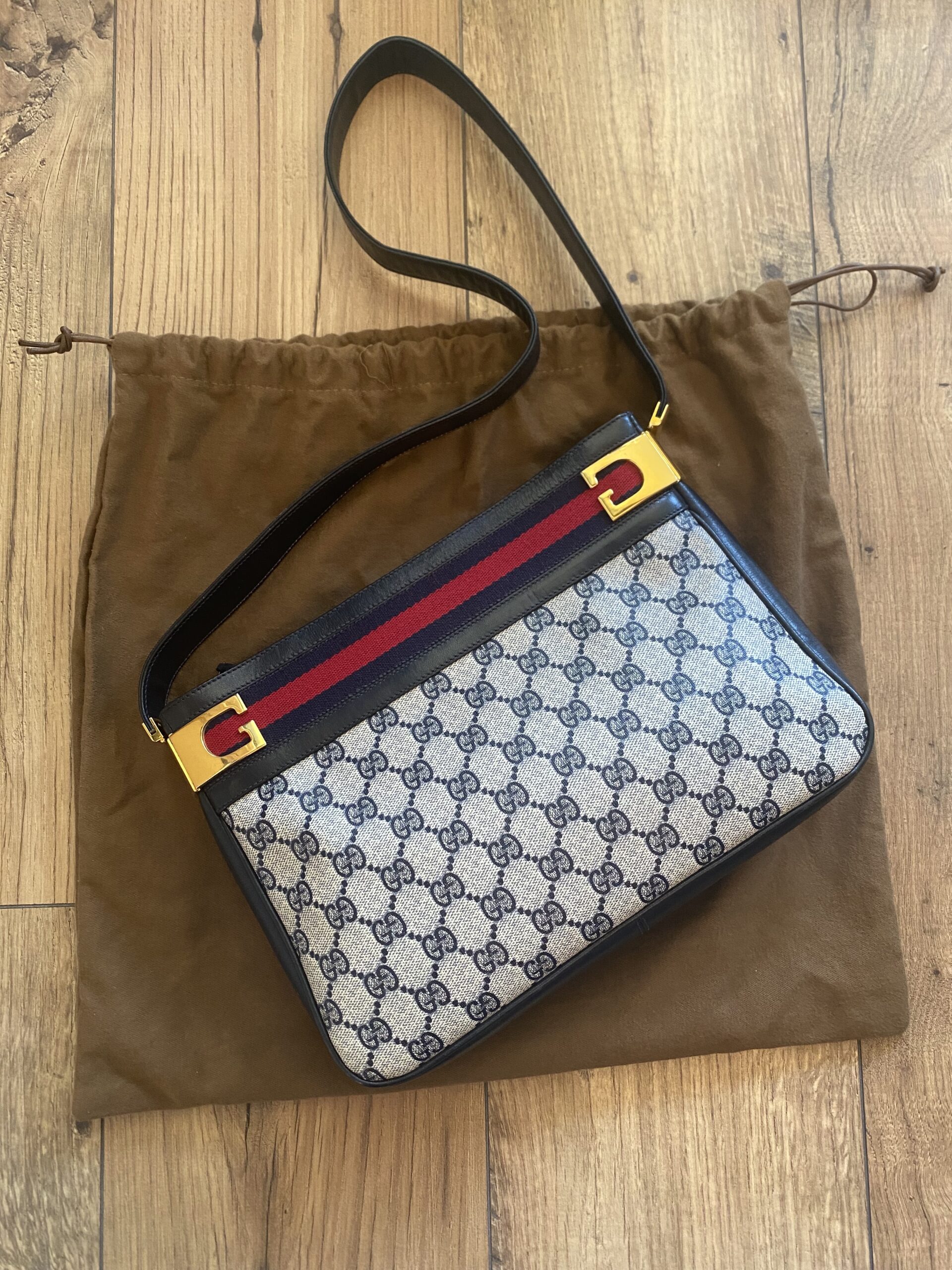 תיק כתף מהפנט מסדרת השרי ליין של גוצ׳י. יכול גם לעבוד כתיק קרוסבודי שיושב קצת גבוה על הגוף ליצרת מראה שסופר טרנדי כרגע. חלקו המרכזי של התיק מעוטר עם הדפס המונוגרם האהוב של בית האופנה בצבע כחול כהה על גבי רקע אפור בהיר. בחלקו העליון, משני צידי התיק, ישנם אבזמים מוזהבים עם סמל המותג שמחברים בין הפס האדום-כחול המוכר של גוצ׳י. השילוב המושלם של צבעי הזהב עם גווני הכחול יוצרים תיק על-זמני וייחודי. לתיק תא מרכזי ותא נוסף פנימי כאשר כל אחד מהם נסגר בעזרת רוכסן. התיק מגיע עם שקית אבק ממותגת.