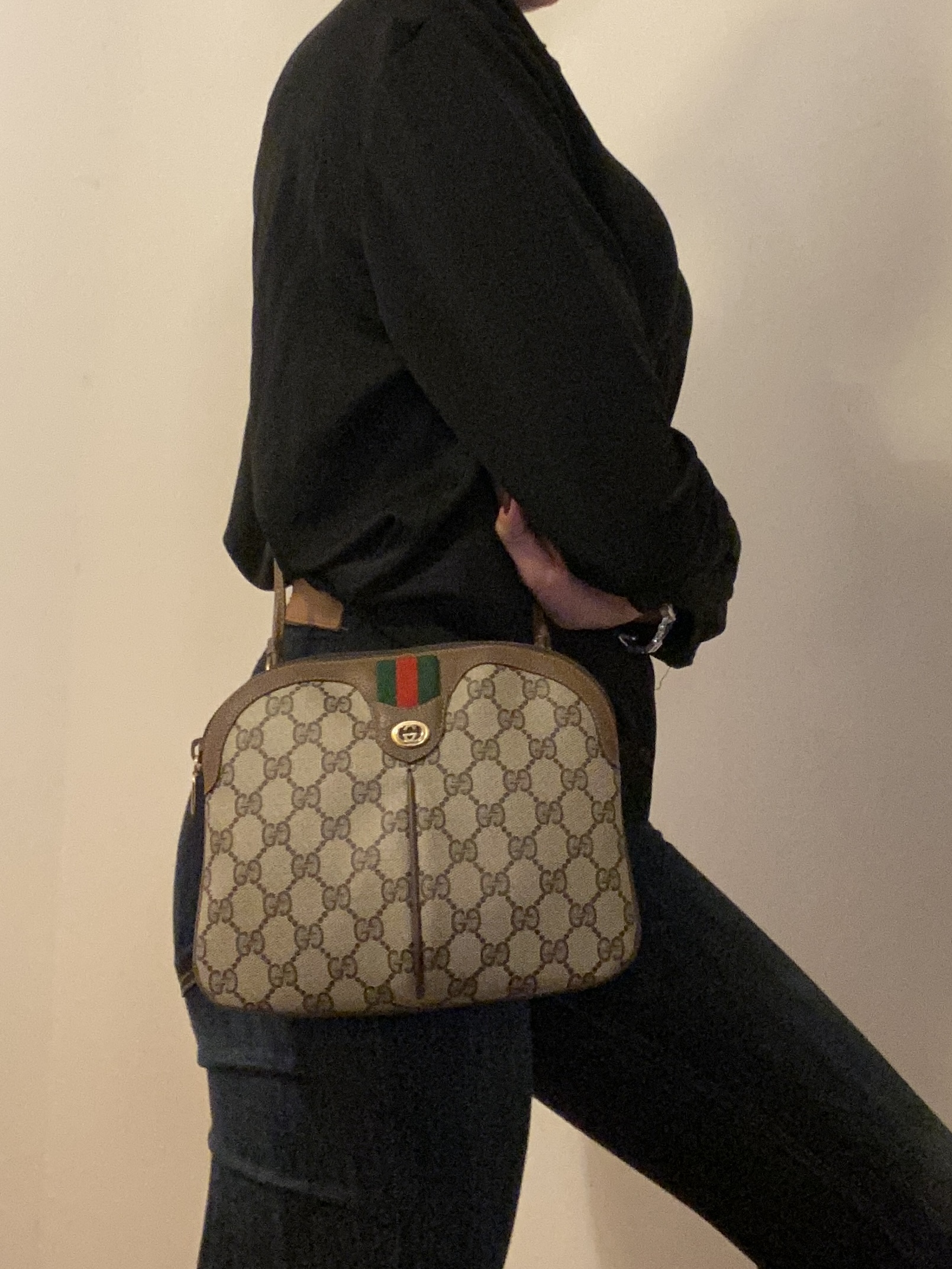 תיק כתף/ קרוסבודי מקסים מסדרת השרי ליין וינטג׳ של גוצ׳י. סמל המותג מופיע בחלקו המרכזי של התיק, גוף התיק מעוטר עם הדפס המונוגרם האהוב של בית האופנה ועם הפס האדום-ירוק המוכר של גוצ׳י. לתיק תא מרכזי שבתוכו יש כיס פנימי קטן. רצועת העור מחוברת לתיק בעזרת אבזמי זהב ייחודים. התיק נפתח בעזרת רוכסן שאליו מחובר תליון מוזהב ממותג עם סמל בית האופנה לייצירת מראה יוקרתי. התיק מגיע עם שקית אבק ממותגת של גוצ׳י.